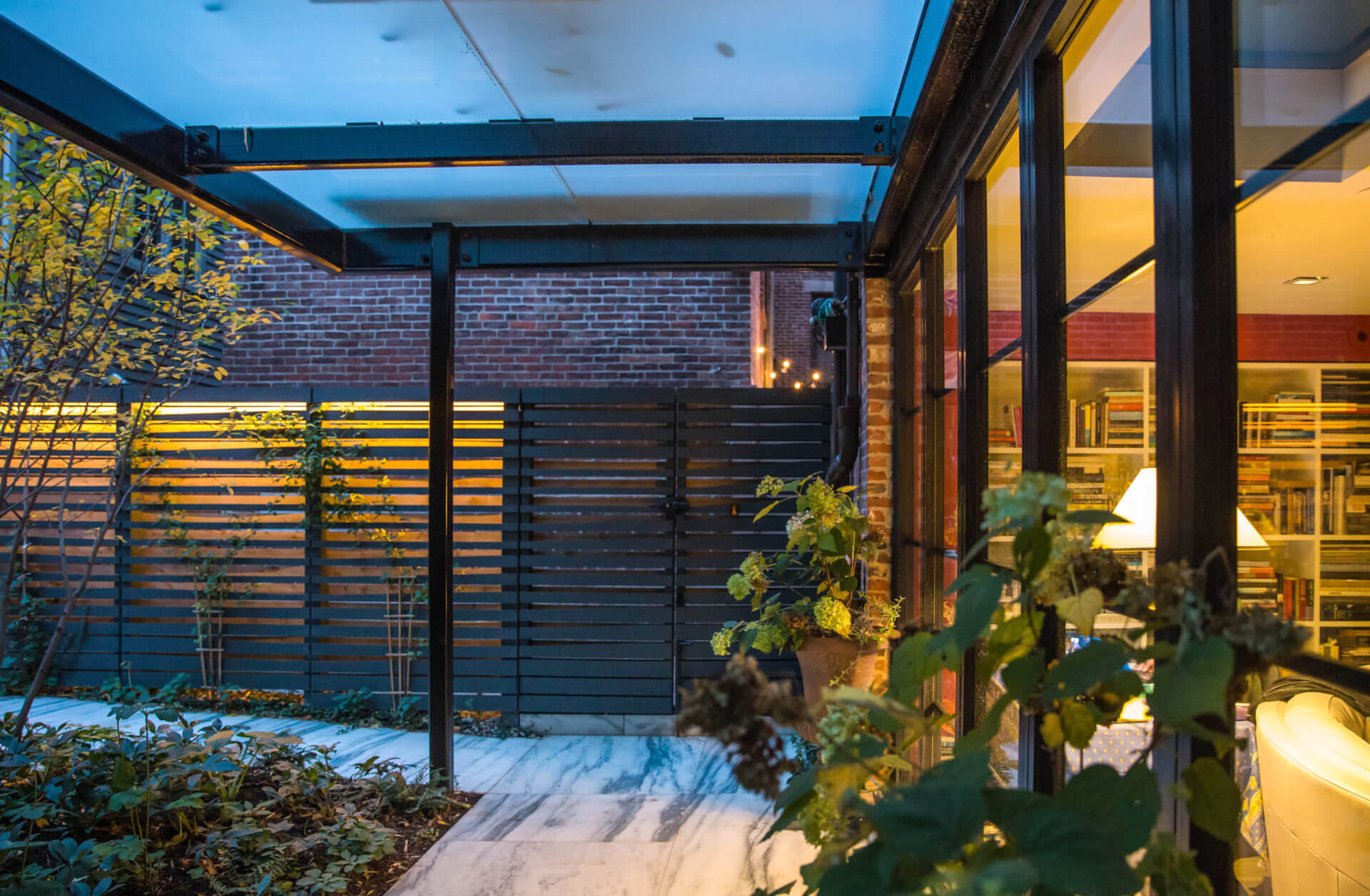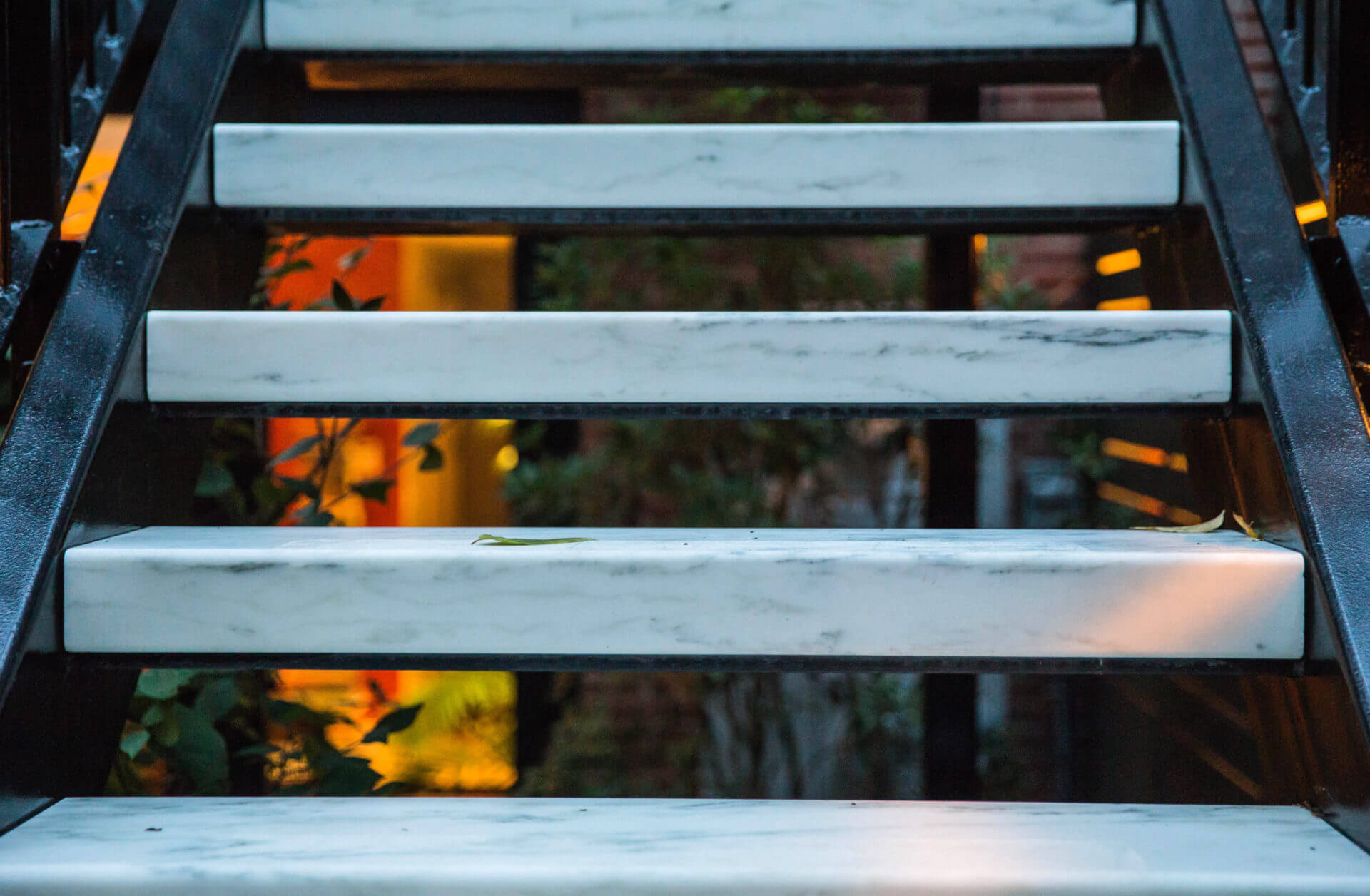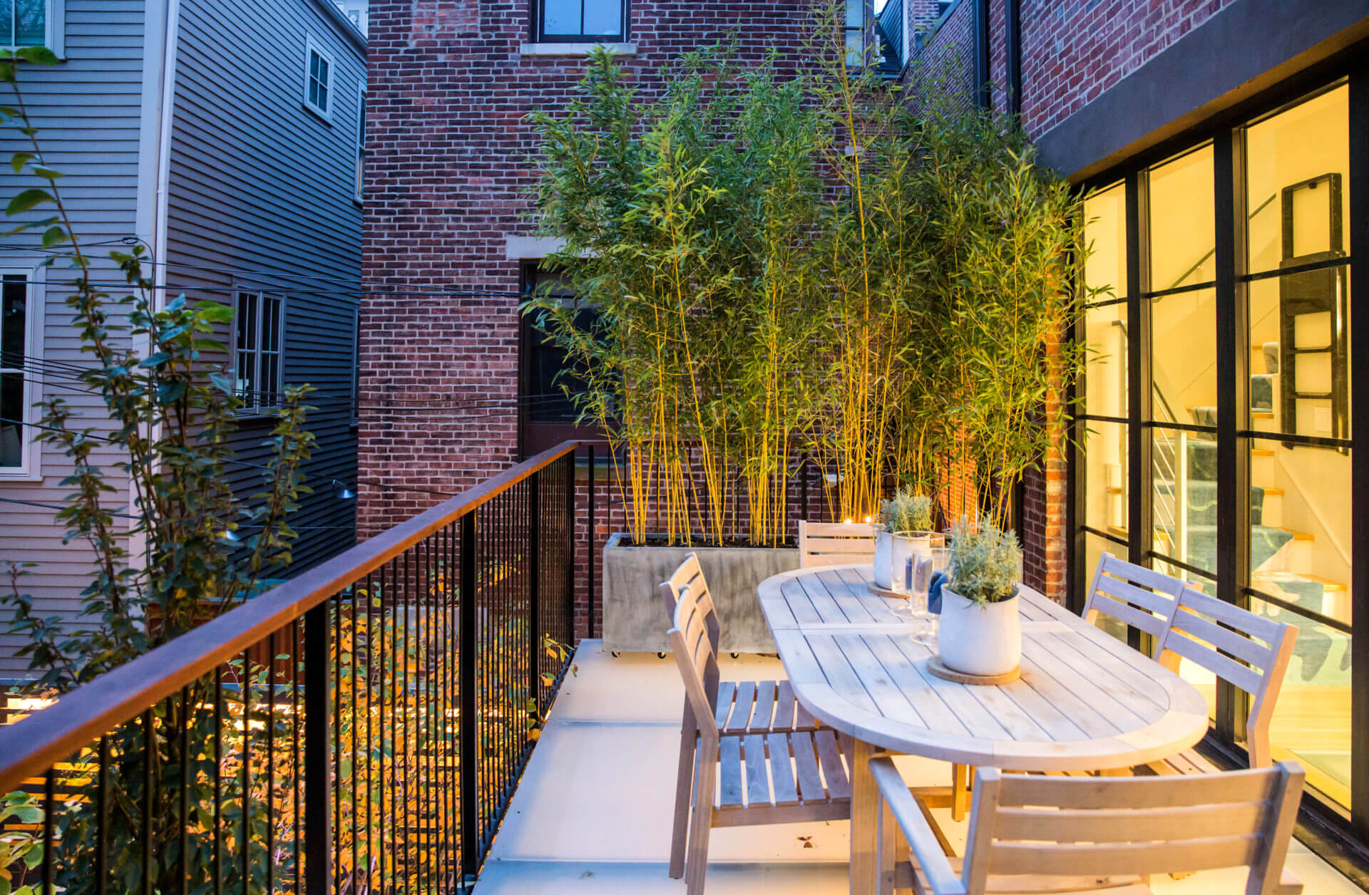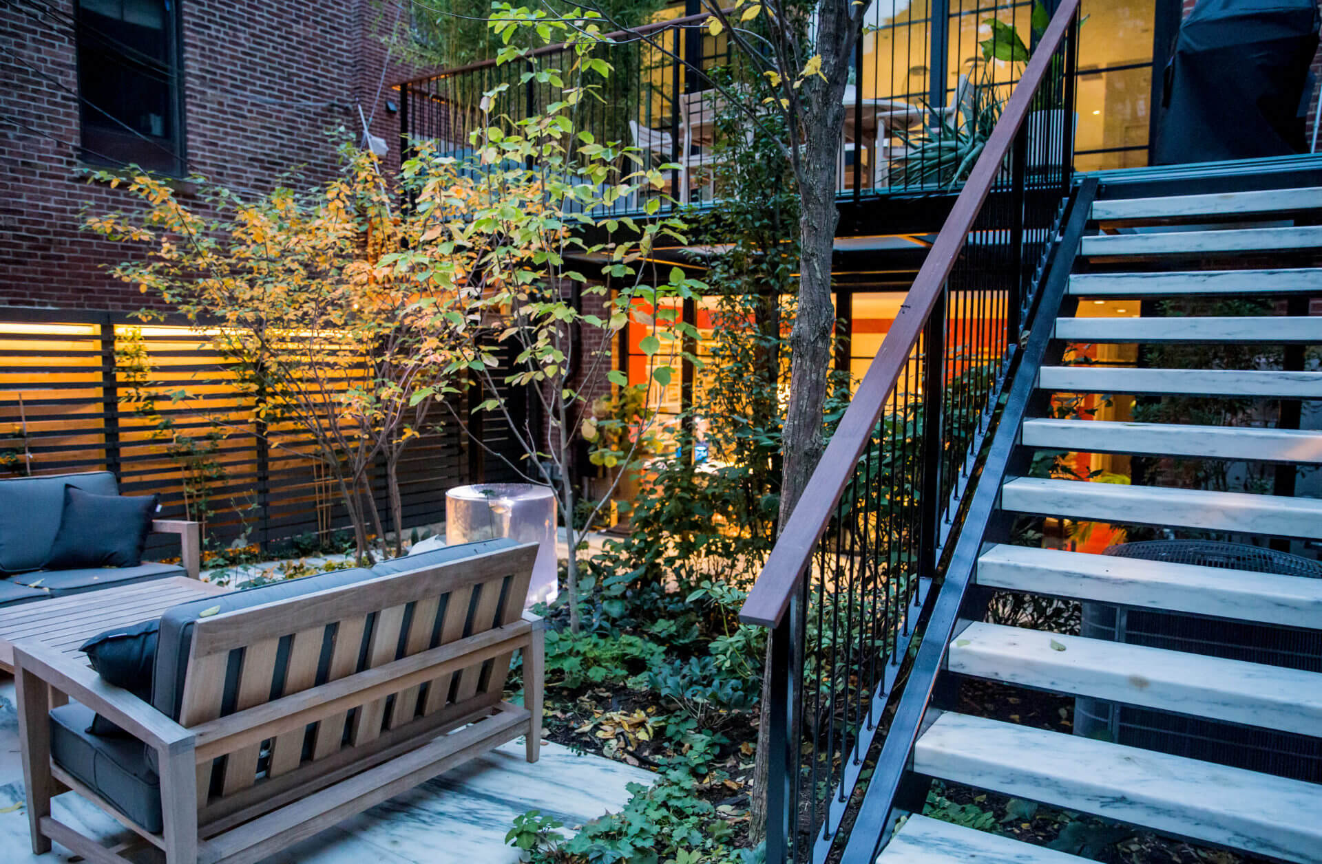 This private south end courtyard was renovated to bring the interior materials of glass and steel out, and to allow the light from outside in. The balcony is constructed of steel and translucent glass in order to allow both outdoor dining, and to allow the light into the ground floor bedroom. The stairs down are made from the same marble as the paving below.