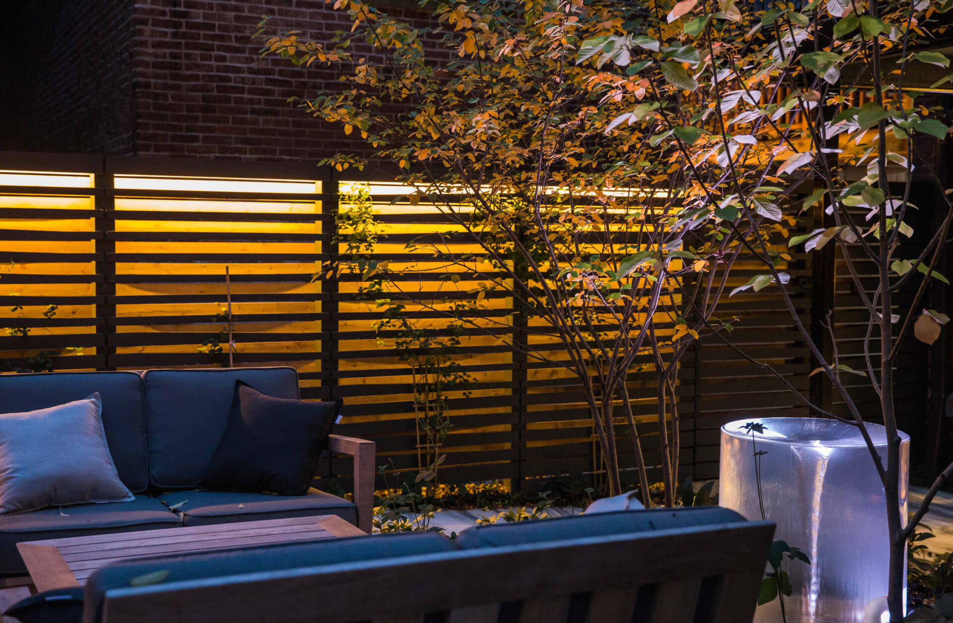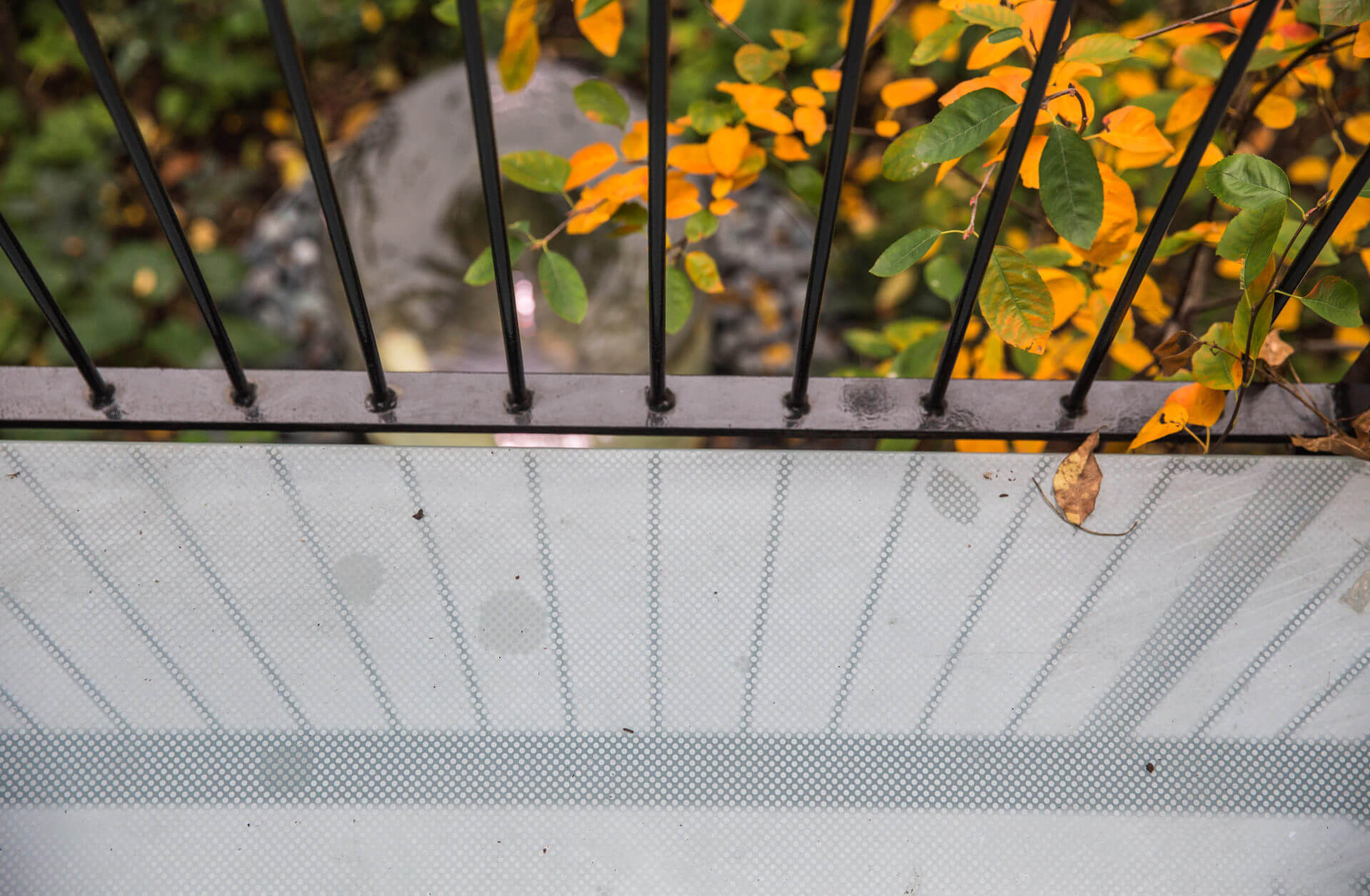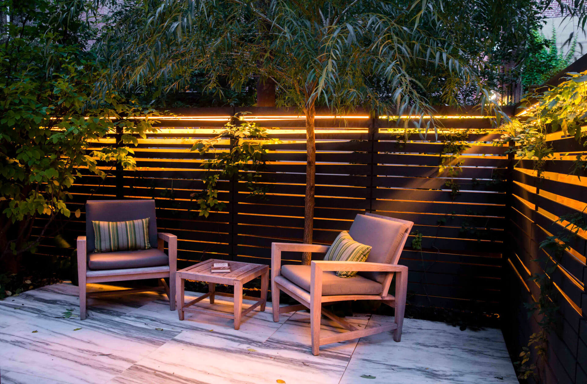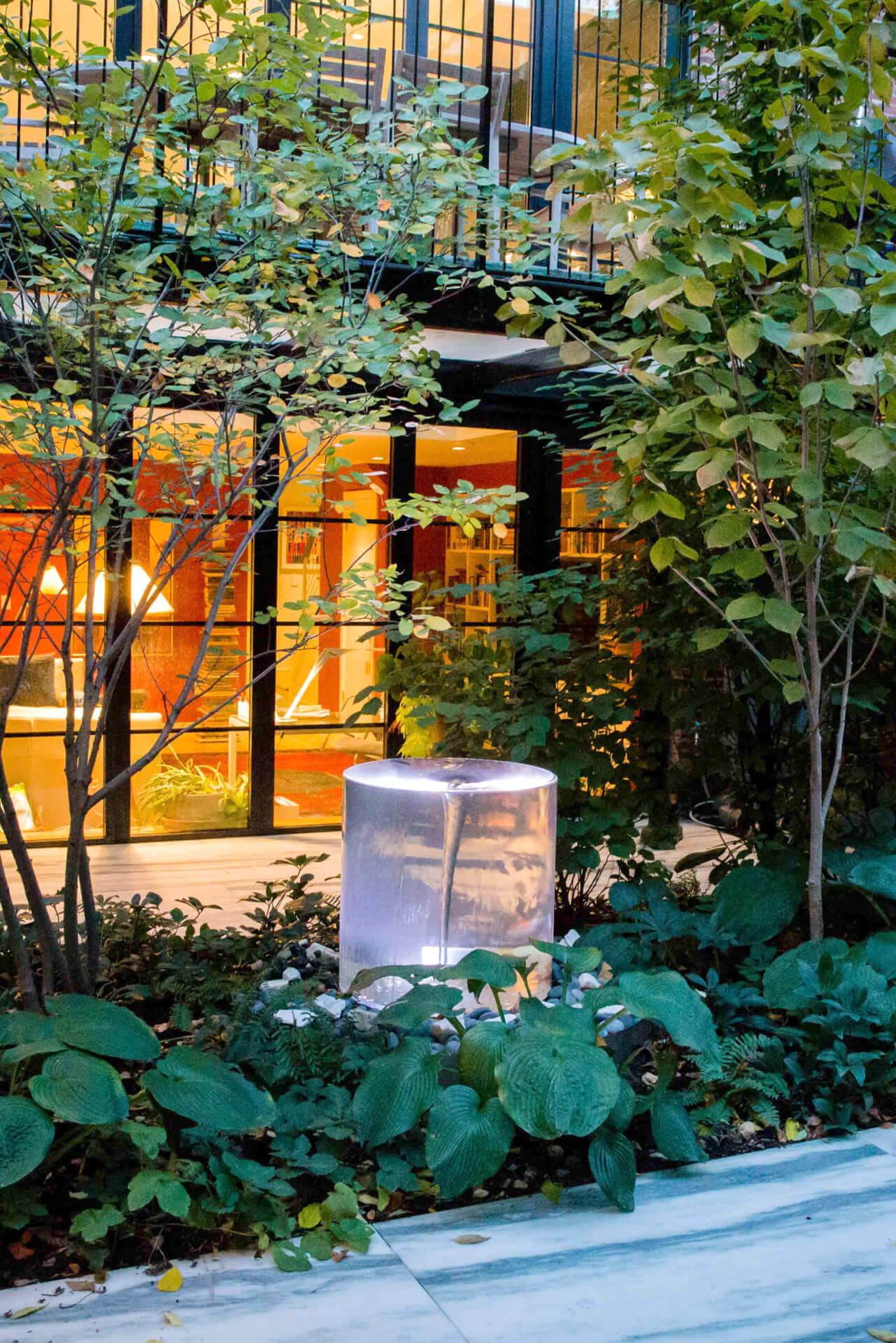 This private south end courtyard was renovated to bring the interior materials of glass and steel out, and to allow the light from outside in. The balcony is constructed of steel and translucent glass in order to allow both outdoor dining, and to allow the light into the ground floor bedroom. The stairs down are made from the same marble as the paving below.