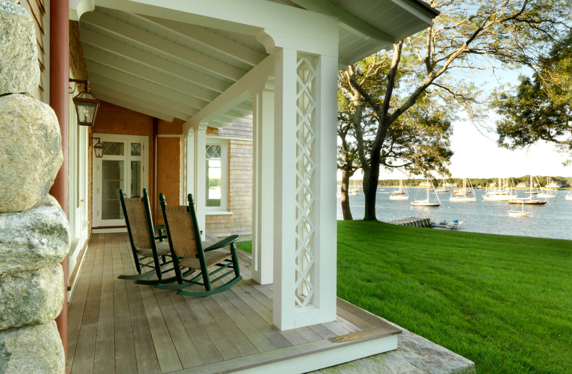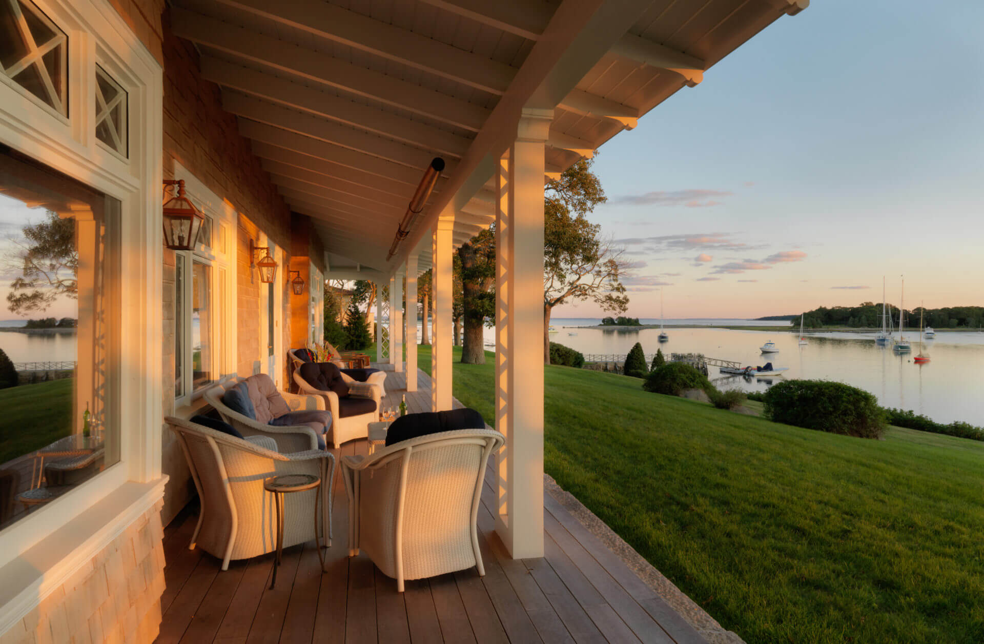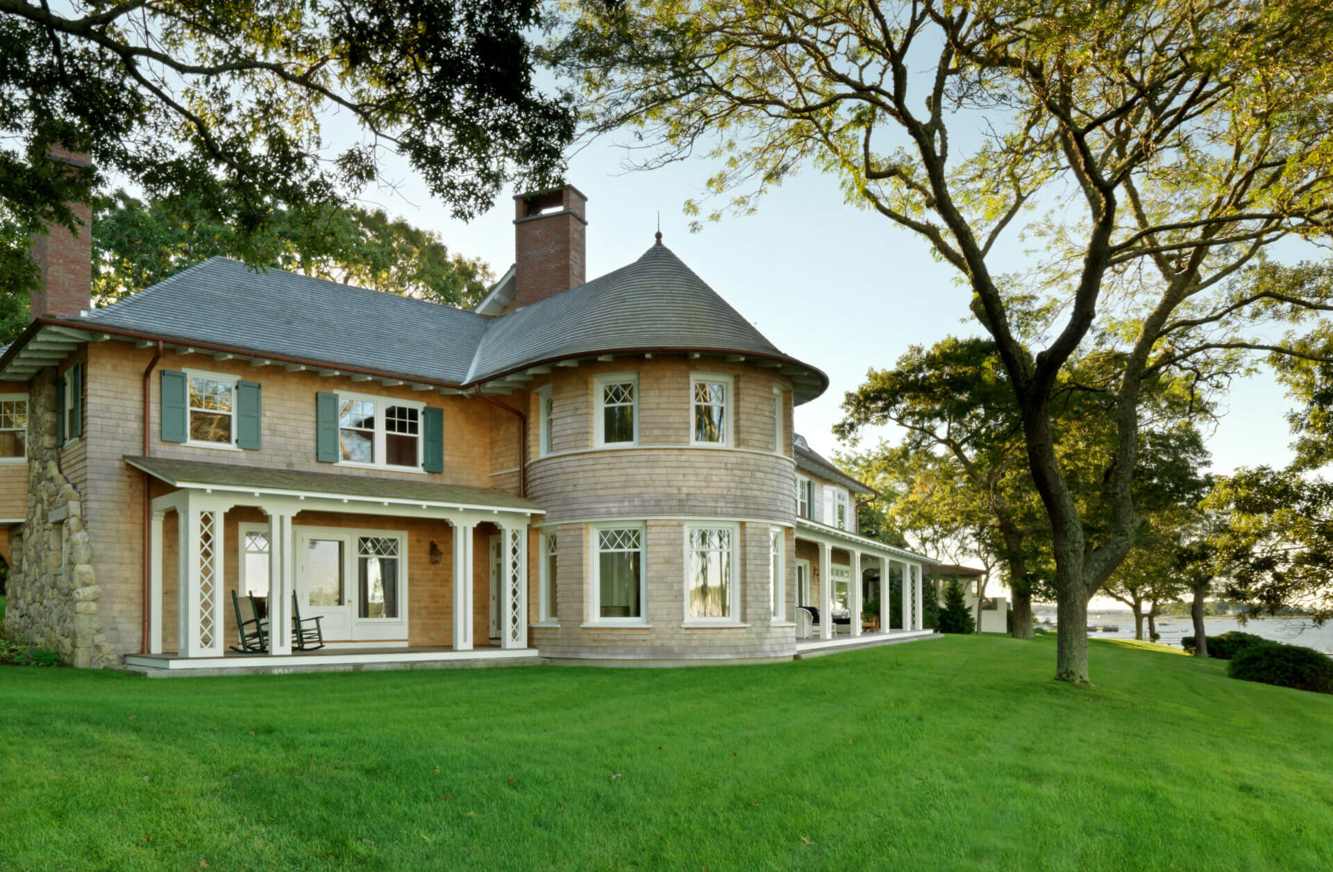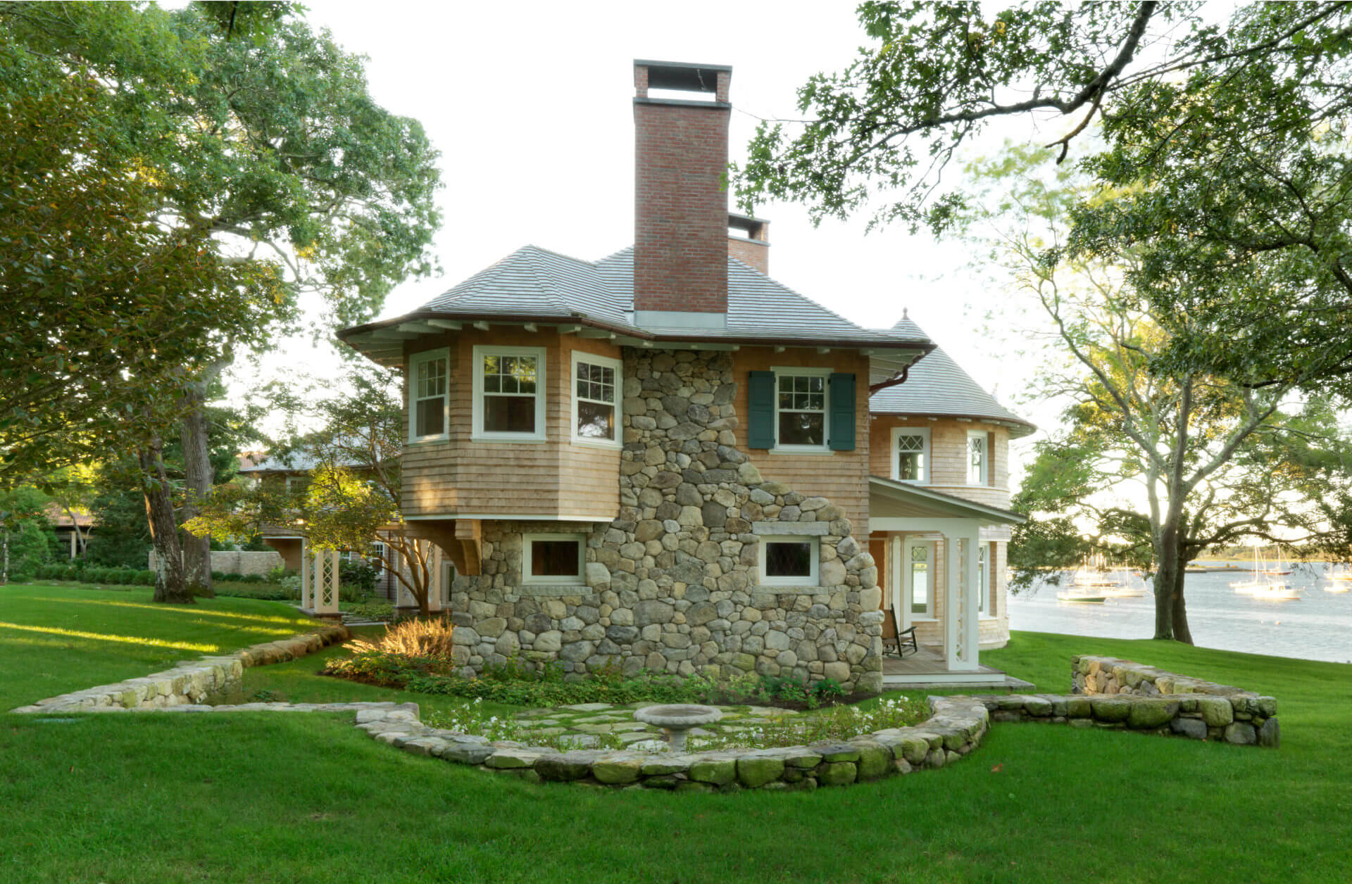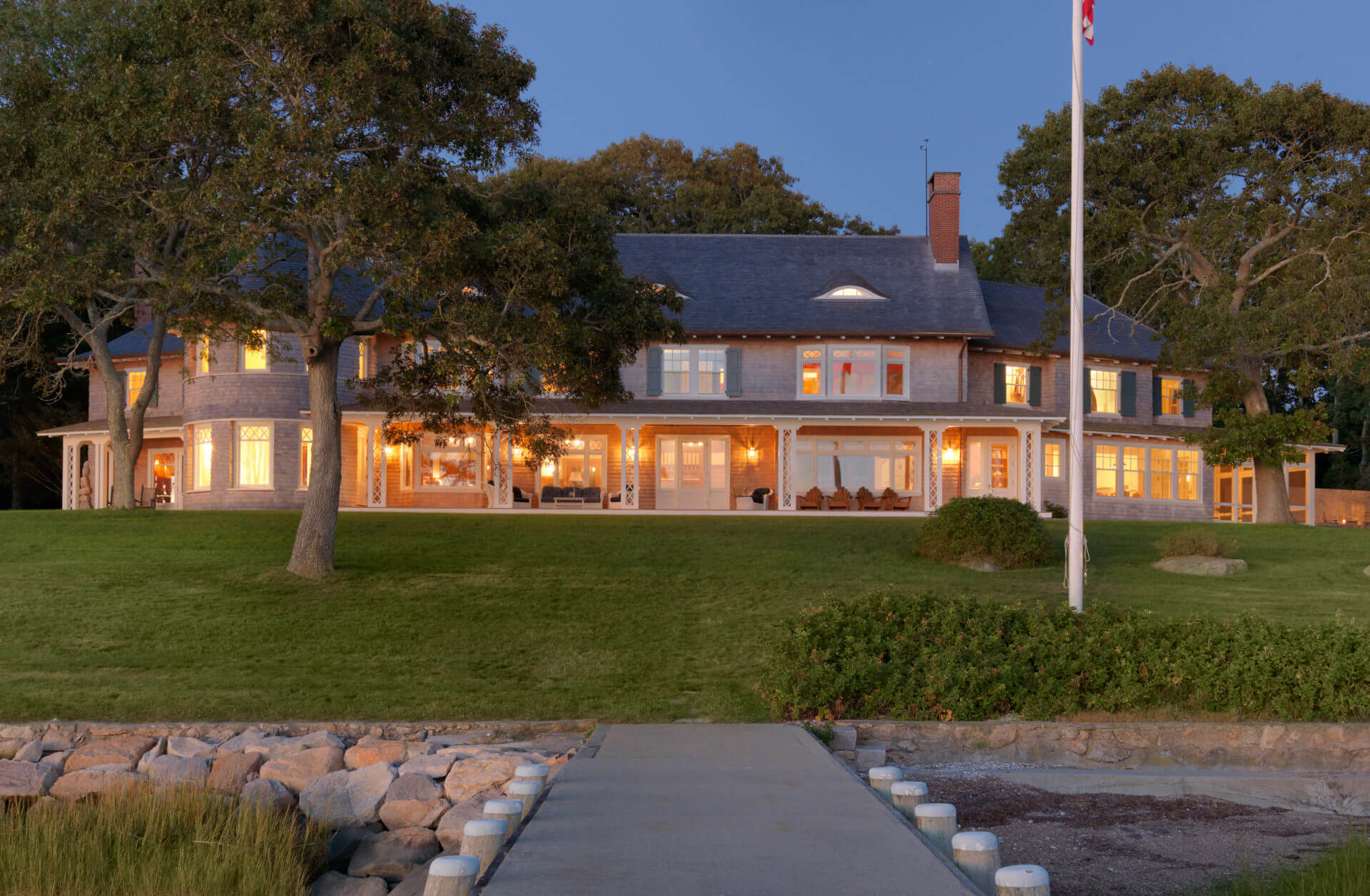 This historic Marion Harbor residence was built in 1905 and had been subject to many renovations over its lifespan. The owner wanted to bring the home back to its original grace. Pulling from historic photos and plans, a modern 1970s addition was removed and a new wing constructed to match the original shape of the house. The addition featured a two-story turret, fieldstone fireplace, and paneled billiards room. The heavily beamed and paneled center action of the house was carefully restored, with the new wing designed to match the original details of the home. Systems and kitchens were updated to allow for modern living, though always with careful attention to the history of the home. The carriage house/ barn was also restored to its original beauty. The landscaping featured a granite and cobblestone parking court, an outdoor kitchen and dining room, and a beautiful lawn sloping down to the harbor.