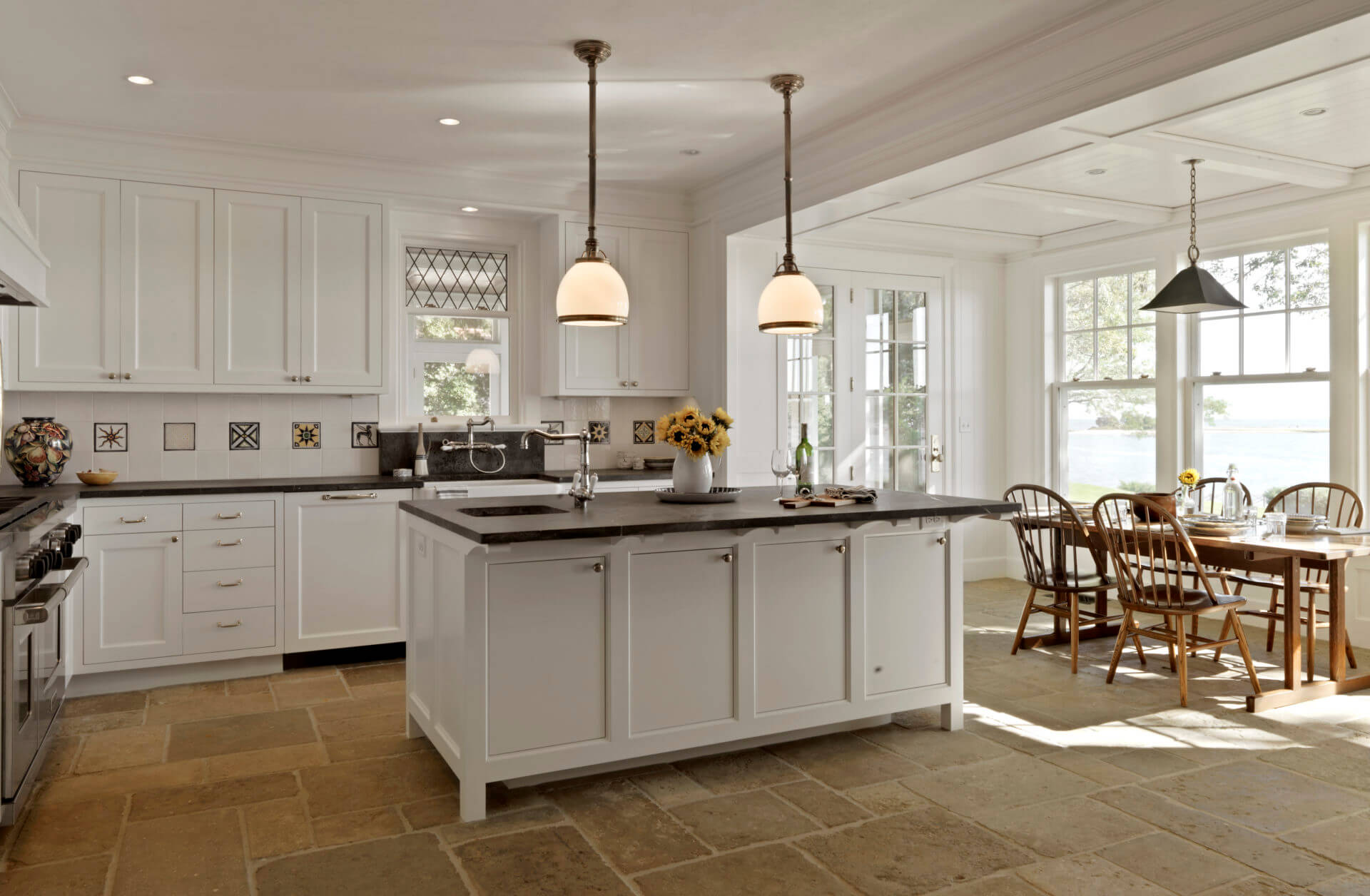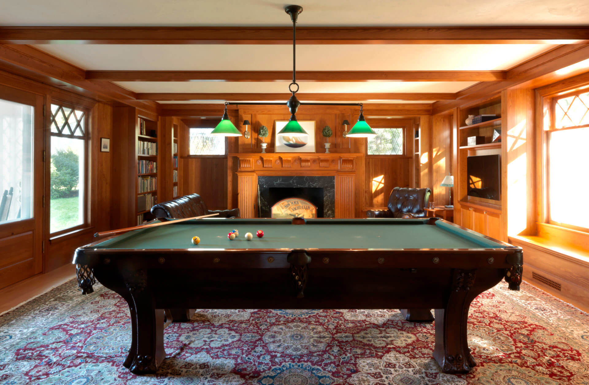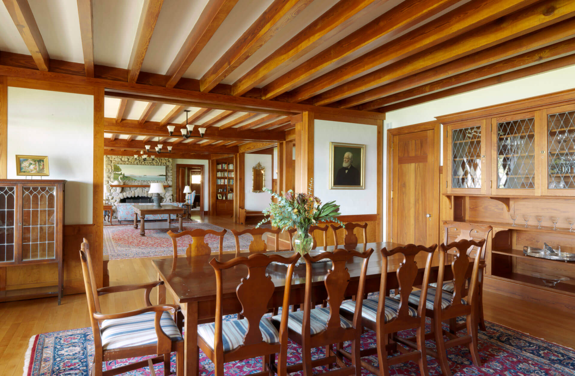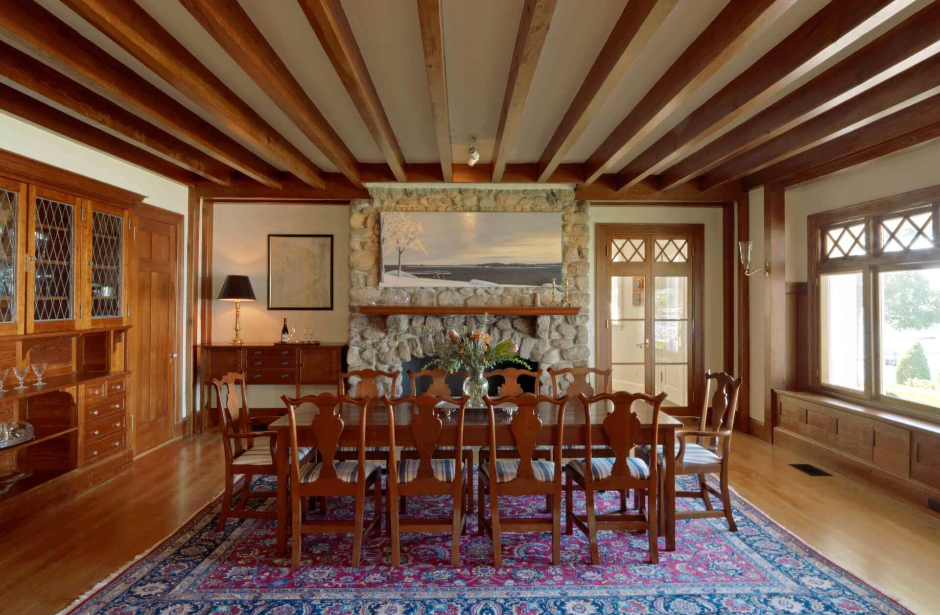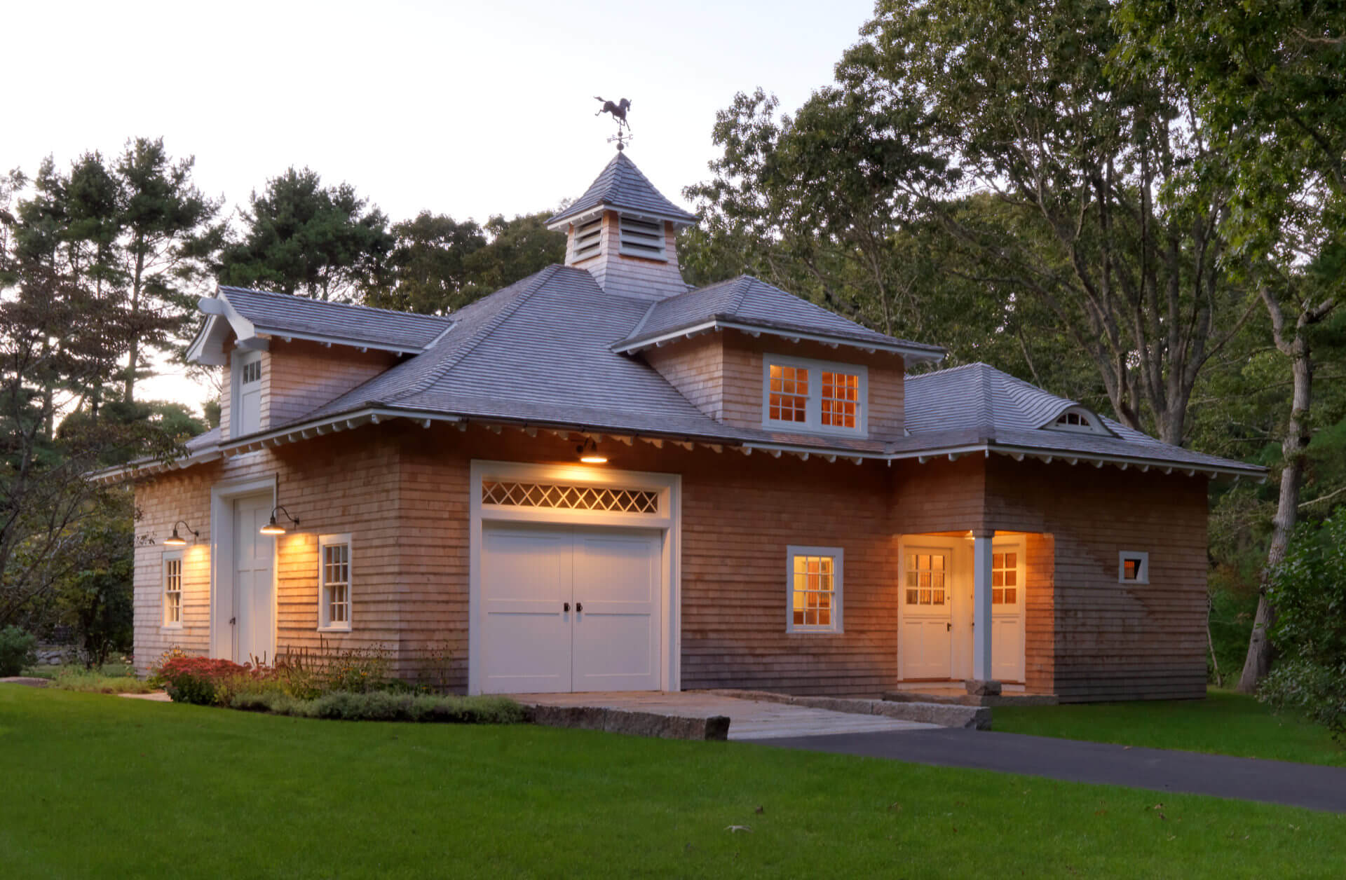 This historic Marion Harbor residence was built in 1905 and had been subject to many renovations over its lifespan. The owner wanted to bring the home back to its original grace. Pulling from historic photos and plans, a modern 1970s addition was removed and a new wing constructed to match the original shape of the house. The addition featured a two-story turret, fieldstone fireplace, and paneled billiards room. The heavily beamed and paneled center action of the house was carefully restored, with the new wing designed to match the original details of the home. Systems and kitchens were updated to allow for modern living, though always with careful attention to the history of the home. The carriage house/ barn was also restored to its original beauty. The landscaping featured a granite and cobblestone parking court, an outdoor kitchen and dining room, and a beautiful lawn sloping down to the harbor.